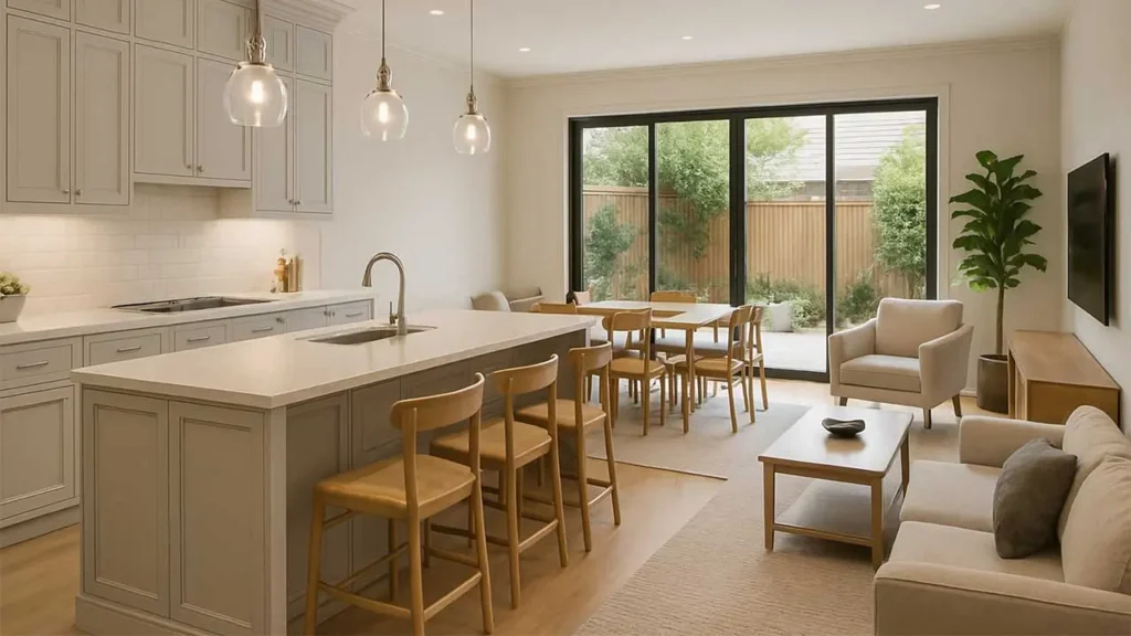 چیدمانهای باز یکی از محبوبترین روندهای طراحی محسوب میشوند، زیرا ارتباطی روان بین آشپزخانه، فضای ناهارخوری و اتاق نشیمن ایجاد میکنند. حذف دیوارها یا جابجایی عناصر میتواند تعامل و حس باز بودن را افزایش دهد و حتی یک بازسازی آشپزخانه کوچک را بزرگتر نشان میدهد.